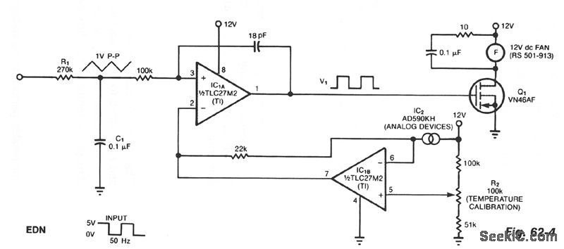 The controller circuit can reduce a fan's noise, power consumption, and wear, particularly in the presence of a low, fluctuating ambient temperature. Mount a temperature sensor in the fan's airstream, and the circuit will adjust the fan speed as necessary to maintain a relatively constant sensor temperature.Input components R1 and C1 integrate the input square wave, producing a quasitriangular wave at the noninverting input of op amp IC1A. At this inverting input is a reference voltage that decreases as temperature increases. The two-terminal sensor produces 1 μA/°K. The result is a rectangular wave at the output of IC1A with a duty cycle proportional to absolute temperature. Thus, a rise in temperature triggers a counter acting cooling effect by delivering more power to the fan. To calibrate the system with the sensor at room temperature, simply adjust R2 for a 50% duty cycle at V1. The fan will switch off at approximately 0℃ and will be fully on at 44℃.