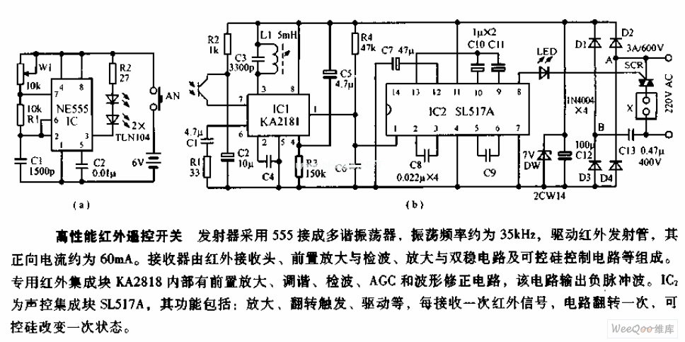This transmitter uses a connected 555 multi-vibrator to drive the infrared infrared lauch tube, the vibrator's oscillation frequency is about 36kHz and its positive current is about 60mA. The receiver is composed of a infrared receiver head, a pre-amplification and detection circuit, an amplification and bistable circuit and a SCR control circuit. The specilized infrared integrated block KA2818 consists of a pre-amplification, tuning, detection, AGC waveform correction circuit, which inputs negative pulse wave. IC2 is a voice control integrated block SL517A, it has such functions as amplification, trigger flipand drive, etc. Everytime it receives infrared signal, the circuir will filp one time, and the SCR will change its state one time.