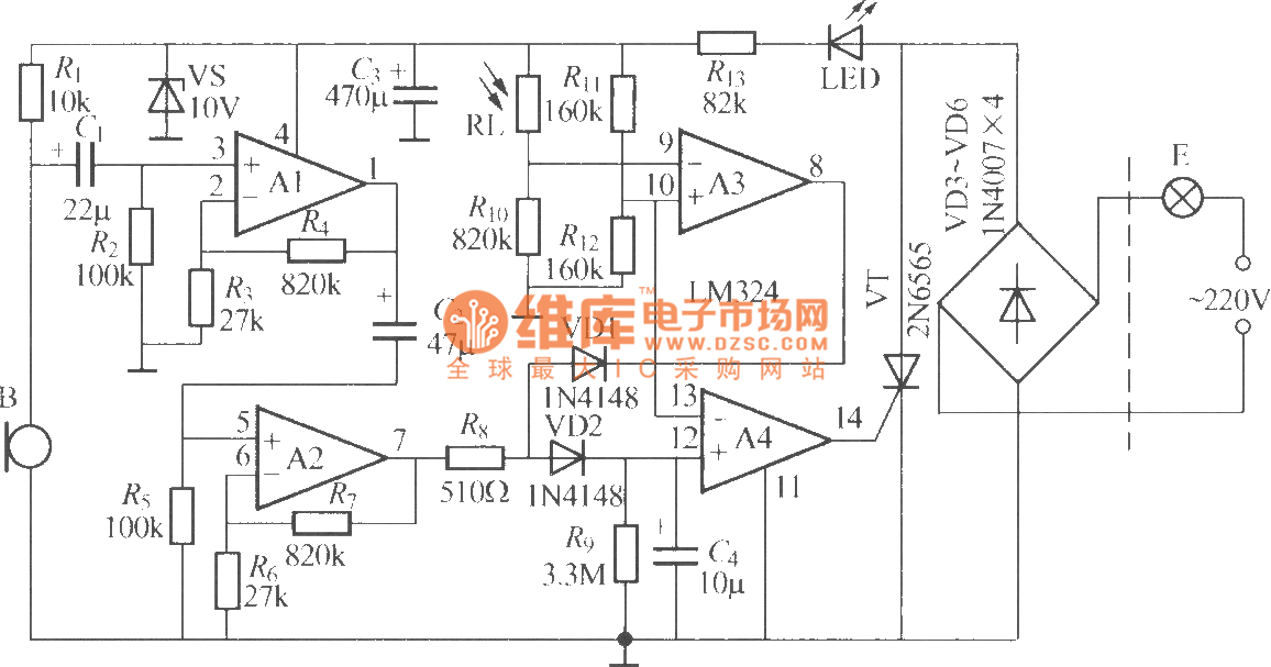 The figure is as shown, it is a acousto-optic control stair delay switch which adopts LM324 operational amplifier, it adopts two-wire system connection, it can replace the ordinary light switch directly, it is not needed to change the indoor original wiring. In figure, the operational amplifier A1~A4 which is connected into four voltage comparator can use a single power supply four operational amplifier IC LM324, theother components are as shown, there is no special requirements.