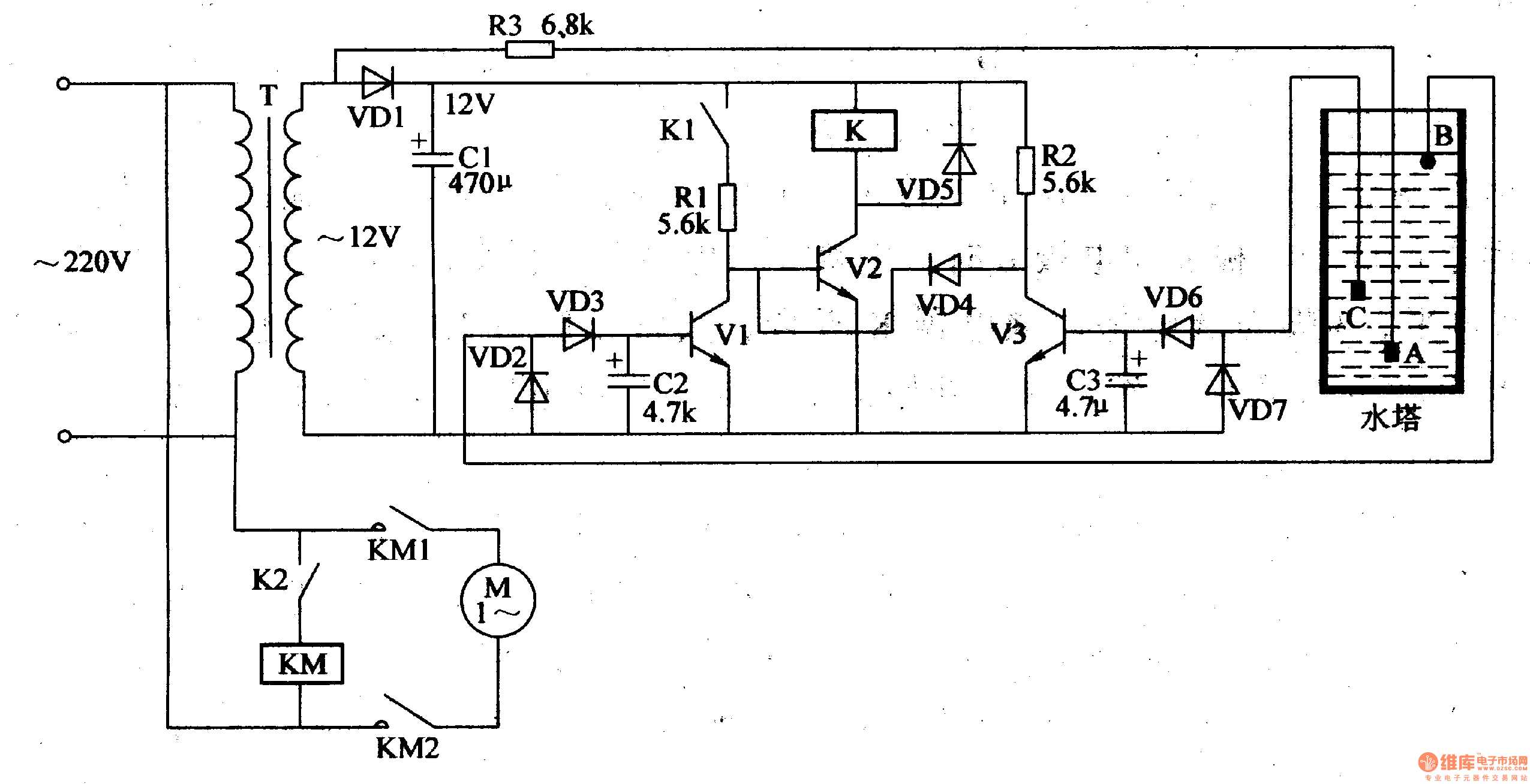 When the level is lower than c, V1 V3 are disconnected and +12V voltage is put on V2, making V2 connected.K is connected and KM begins to work. M begins to feed water.