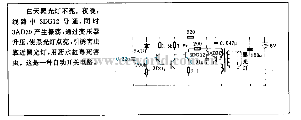 During the day, the black light lampdoes not light. At night, 3DG12 turns on, at the same time, 3AD30 produces oscillation, it is rised by transformer, then the black light lamp is lightened, it can attract pests, then it will use drug tank to poison the pests. It is an automatic switch circuit.