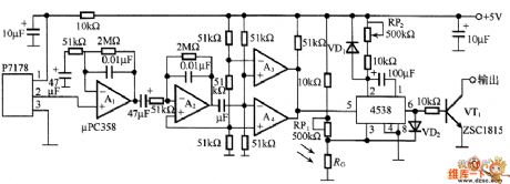 The circuit is composed of amplifier, comparator and an output control part. According to Faraday's law, person's body temperature is about 37 ℃, radiation infrared wavelength is about 10μm, the pyroelectric sensor selects P7178 with 7 ~ 20μm sensitive wavelength range. A1 and A2 are selected low noise, low loss CMOS op amp μPC358, and it is connected to band-pass filter composed of RC to prevent the entry of the noise and error signal, extracting only a signal when the human body moves. A3 and A4 constitute a comparator.