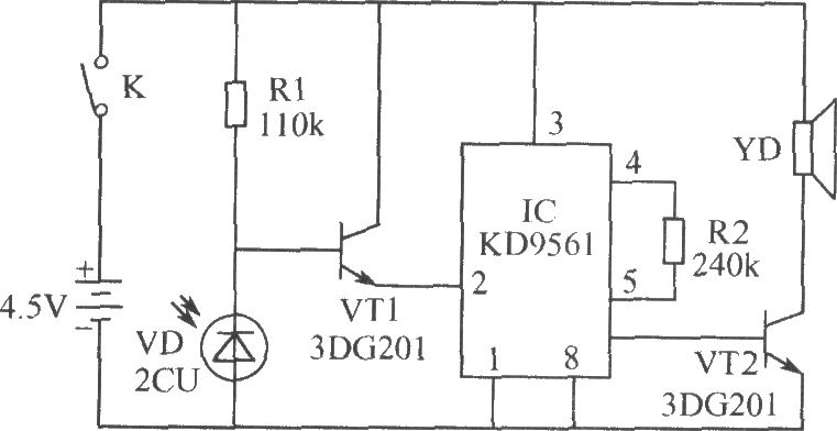 The alarm is mounted in a drawer. If the thief opens your drawer at night, the alarm will send the souud of ow - ow to warn thieves, and they will dare to start. Photosensitive diode VD, transistor VT1 and resistor R1 form a light control switch; integrated circuit IC, transistor VT2 and speaker YD form the alarm circuit. IC uses the KD-9561 four-tone analog alarm audio Manifold. VT1 and VT2 select 3DG201 silicon transistor with β value being greater than 60. VD selects 2CU photodiode. R1 and R2 use 1W carbon film resistors. YD uses 2.5 inches of electric speaker with impedance in 8Ω. Power select 3 and 5 battery. K selects small, self-resetting and normally closed contact button switch.