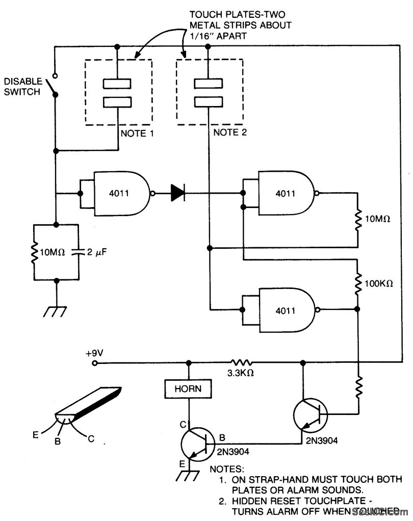 Aslong as touch plates (1) are touched together,the alarm is off. If not held for about 30 seconds,the alarm goes off. The circuit can be disabled with switch or by touching the plates (2),The alarm is battery operated by a bicycle horn.