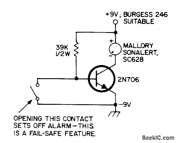 Operates from small 9-V battery, making it independent of AC power failure. Opening of switch or equivalent breaking of foil conductor removes ground from base of transistor, to energize alarm.-Circuits, 73 Magazine, April 1973, p 132.