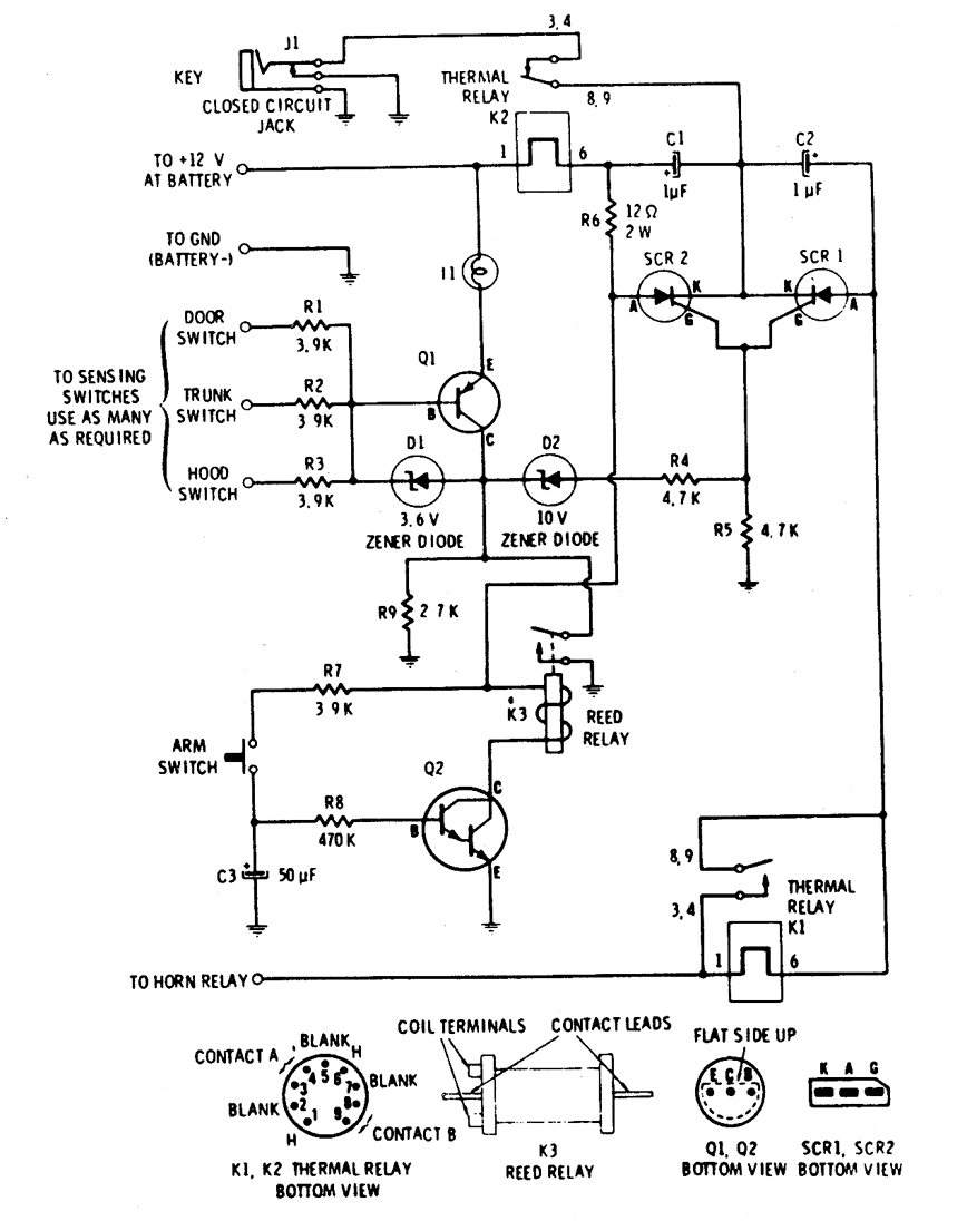 The circuit has a built-in, self-arming feature. The driver turns off the ignition, presses the arm button on the Computalarm, and leaves the car. Within 20 seconds, the alarm arms itself-all automatically! The circuit will then detect the opening of any monitored door, the trunk lid, or the hood on the car. Once acti-vated, the circuit remains dormant for 10 sec-onds. When the 10-second time delay has run out, the circuit will close the car's horn relay and sound the ham in periodic blasts (approxi-mately 1 to 2 seconds apart) for a period of one minute. Then the Computalarm automatically shuts itself off (to save your battery) and re-arms. If a door, the trunk lid, or the hood re-mains ajar, the alarm circuit retriggers and another period of horn blasts occurs. The Com-putalarm has a key switch by which the driver can disarm the alarm circuit within a 10-second period after he enters the door. The key switch consists of a closed circuit jack, J1, and a mating miniature plug.