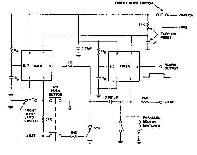 555 timer produces a guaranteed delay, allowing the driver to deactivate the alarm and the elimination of a control switch vulnerable outside.