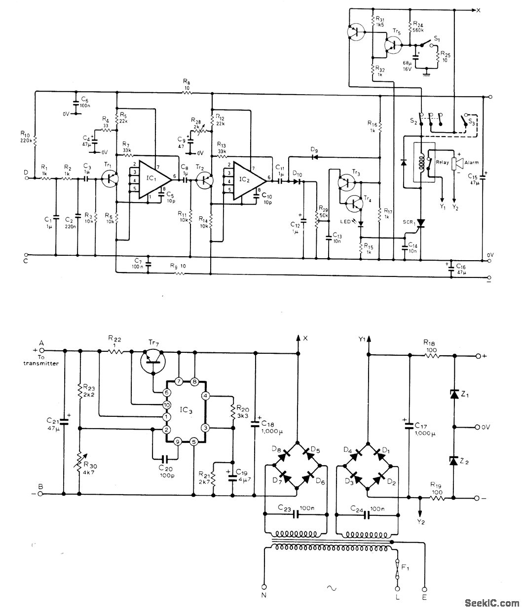 Small radar transmitter operating at 10.687 GHz fills pro-tected area with radio waves. Waves reflected from stationary objects are ignored by receiver, while waves undergoing Doppler shift in fre-quency by reflection from moving object such as intruder are selectively amplified for trigger-ing of alarm. Single waveguide section is di-vided into two cavities, each having Gunn diode; transmitter cavity feeds points A and B of transmitter TR7-IC3, and other cavity feeds points C and D of amplifier that drives alarm relay. Article covers construction and operation of circuit and gives sources (British) for parts and construction khs. Opamps are SN72748 or equivalent, IC3 is μA723 or equivalent, Tr1-Tr3 are ZTX500 or equivalent, Tr4-Tr6 are ZTX302 or equivalent, Tr7 is 3055, D1-D8 are 1N4001 or equivalent, D9-D10 are 1N914, SCR1 is TIC44 or equivalent, Z1-Z2 are BZY88-C8V2, relay is 18-V with 1K coil, Doppler module is Mullard CL8960 or equivalent, and seff-oscillating mixer for re-ceiver is Mullard CL8630S or equivalent. Alarm stays on until reset by appropriate swhch.-M.W. Hosking, Microwave Intruder Alarm, Wire-less World, July 1977, p 36-39.