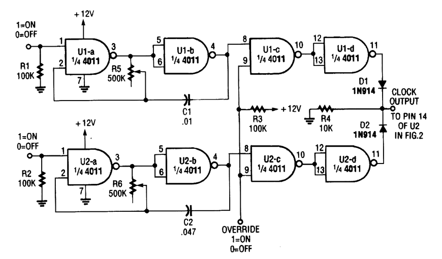 This oscillator can be used to drive a stepper motor circuit at two preset speeds with override to shut the motors off.