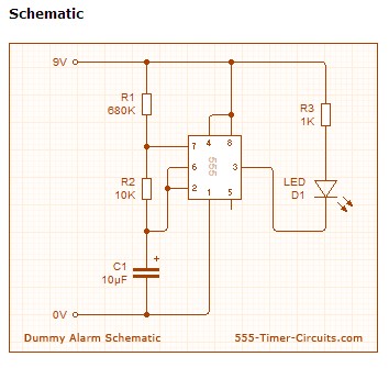 This Dummy Alarm project makes an LED flash briefly once every 5 seconds to imitate the indicator light of a real alarm. Overview The circuit is designed to use very little current to prolong battery life so that it can be left on permanently. An on/off switch is not included, but could be added if you wish. The 7555 timer IC used is a low power version of the standard 555 timer. A 憇uperbright?red LED is used because this provides a bright flash with a low current. The LED is off for most of the time so the average total current for the circuit is less than 0.2mA. With this very low current a set of 3 alkaline AA cells should last for several months, maybe as long as a year.