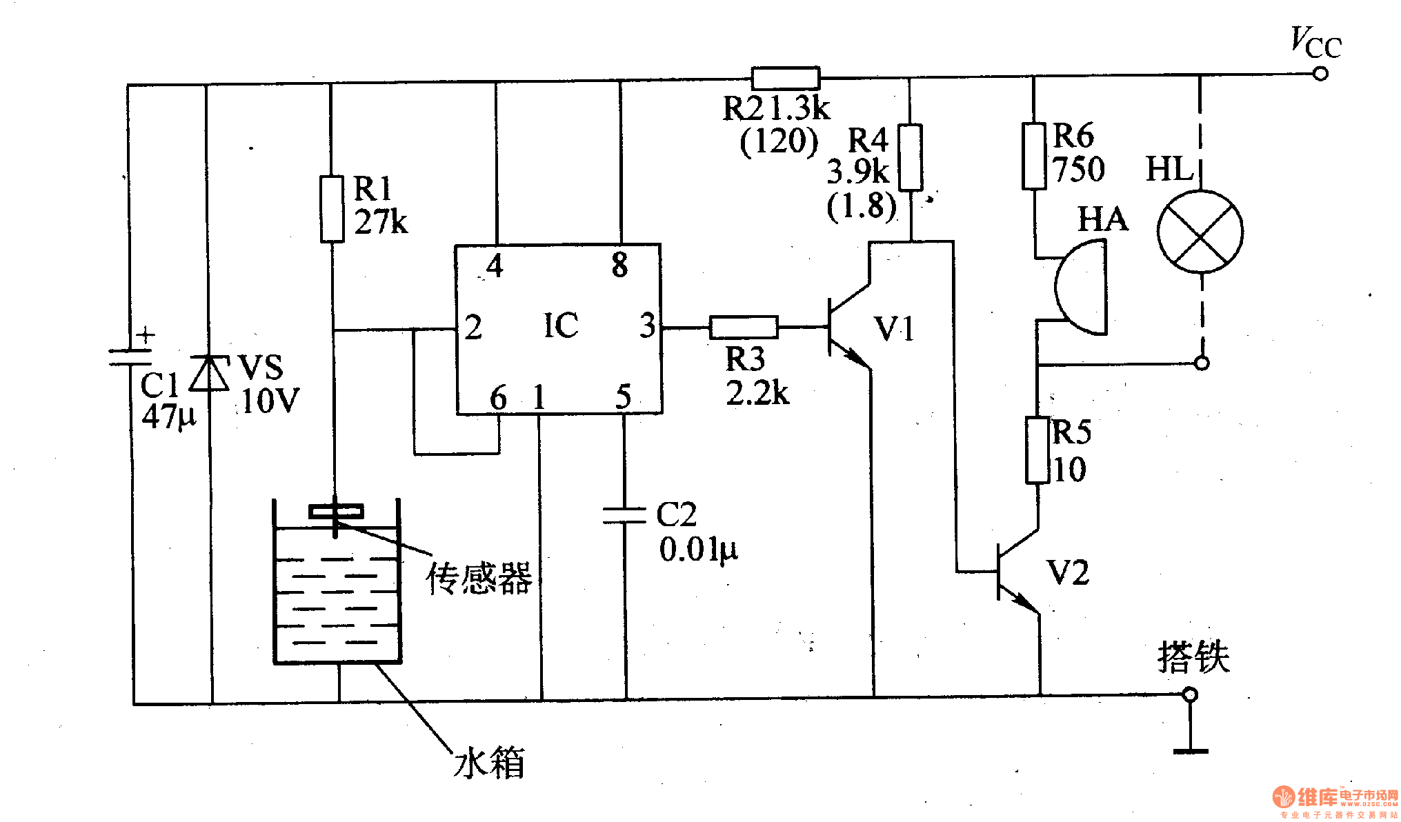 While the engine is not short of water, the electrode of the sensor is connected to ground (the iron) to make the voltage of pin 2 and pin 6 at low level (lower than Vcc/3). The output of pin 3 is at high level to make V1 on, and V2 cut off, then HA is noiseless and HL is off. While the water level of the engine is below the electrode of the sensor, the voltage of pin 2 and pin 6 are at high level (higher than 2Vcc/3). The circuit of IC changes and pin 3 outputs low voltage to make V1 cut off ,and V2 on, and then HA send out beeps and HL is also on to warn the driver the engine is short of water.