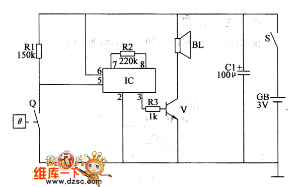 The frost alarm circuit is composed of the power supply circuit, control circuit and temperature detection alarm circuit, and it is shown in Figure 1. Power supply circuit consists of battery CB, power switch s and electric hot thermometer Q. The alarm circuit consists of the sound integrated circuit IC, resistors R2, R3, transistor V and the speaker BL. RI ~ R3 use the 1/4W metal film resistors or carbon film resistors. C selects the electrolytic capacitor with voltage in 6.3V. V uses the 59013 or CW9561-type audio integrated circuit. BL uses the 0.25W, 8Ω electric loudspeaker.