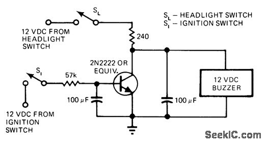 Designed for cars in which headlight switch is nongrounding type, providing 12 V when dosed. When both light and ignition switches are closed, transistor is saturated and there is no voltage drop across it to drive buzzer. If ignition switch is open while lights are on, transistor bias is removed so transistor is effectively open and full 12 V is applied to buzzer through 240-ohm resistor until lights are turned off.-R. E. Hartzell, Jr., Detector Warns You When Headlights Are Left On, EDN Magazine, Nov. 20, 1975, p 160.
