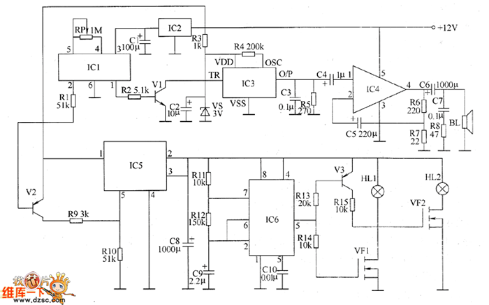 The voltage-stabilizing circuit is composed of three-terminal voltage regulator integrated circuit IC2, resistor R3, zener diode VS and filter capacitors C1, C2. Pyroelectric infrared detecting trigger circuit is composed of the pyroelectric infrared detection module IC1, transistors V1, V2, resistors R1, R2 and potentiometer RP. Electronic switch circuit consists of the electronic switch IC IC5, resistors R9, R10 and capacitor C8. Audio power amplifier consists of the power amplifier integrated circuit IC4, resistors R6 ~ R8, capacitors C4 ~ C7 and speaker BL. Low-frequency oscillator circuit consists of the time-base integrated circuit IC6, resistors R11, R12 and capacitors C9, C10 and other components.