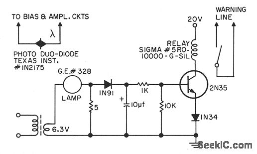 Used when photocells and lamps are employed to detect end of magnetic tape, lood point, or bad spot.Failure of lamp can cause serious trouble in magnetic tape handler. With circuit showm, when lamp burns out, transistor can no longer energize relay, and relay contact doses to actuate alarm at computer console.-J. E. Kienle and R. W. Wooldridge, Photocell Lamp Burnout Warning Circuit, EEE, 10:8, p 27-28.