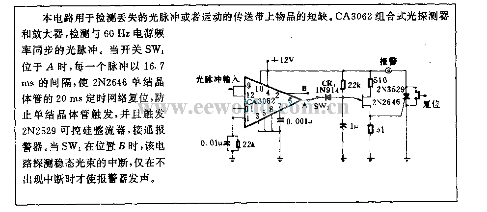 This circuit is used to test missing light pulse or the shortages of goods in sport transport tape. CA3062 combined photodetector and amplifier, it can test the light pulse which is synchronous with 60Hz power supply frequency. When switch SW1 is in A, each pulse is as 16.7ms interval to reset the 20ms timing network of 2N2646 unijunction transistor, to prevent unijunction transistor from triggering, and to trigger 2N2529 SCR turn on alertor. When SW1 is in B, this circuit interrupts detection steady light beam, the alertor alarms only in the case of without interruption.