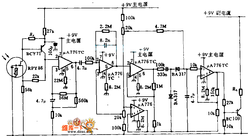 Detector RPY86 is produced by Mullard, and it only makes responses to the wavelength which isgreater than 6μm. It has not any response to thebackground light caused by sunlight and the sun. In order to gather infrared light onto the detector, it uses cheap mirror instead of Lens. μA776 is a programmable operational amplifier, and its bias current is only 300μA, which can be recharged by a small battery. Ra should be selected carefully, and the first operational amplifier's input voltage is 2 ~ 6V. Only when the thieves walk around the monitored area, the changes caused by the incident light will makethis circuit pull the alarm relay RL.
