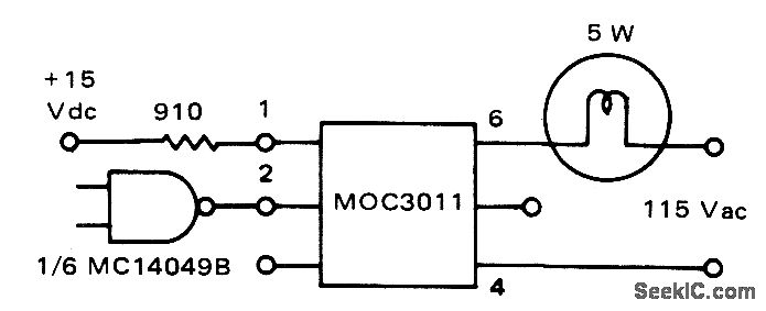Motorola MOC3011 optoisolator serves as interface between CMOS logic of microprocessor and 5-W 115-VAC lamp.Input logic is connected to energize infrared LED of optoisolator by providing up to 50 mA.Once triggered, indicator lamp remains on until current drops below holding value of about 100 μA.-P. O'Neil, Applications of the MOC3011 Triac Driver, Motorola, Phoenix, AZ, 1978, AN-780,p2.