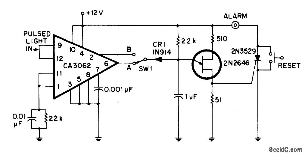 Developed for sensing missing light pulses or detecting absence of object on moving conveyor belt. CA3062 com bination light sensor and amplifier detects light pulses synchronized to 60-Hz line. With SW1 at A, each pulse resets 20-ms timing network of 2N2646 UJT at 16.7-ms intervals, preventing UJT from firing. If light beam is interrupted by object, UJT is allowed to fire and trigger 2N3529 SCR that turns on alarm. With SW1 at B, circuit detects interruptions in steady light beam and sounds alarm only when interruption does not occur.-J. F. Kingsbury, Double Duty Photo Alarm, EDN|EEE Magazine, May 15, 1971, p 51.