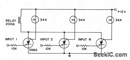 Any of several inputs will pull in common alarm relay, with corresponding lamp giving visual indication of triggered circuit. For higher-current laps, use 3N81 silicon controlled swilches.- Iransistor Manual, Seventh Edition, General Electric Co., 1964, p 425.