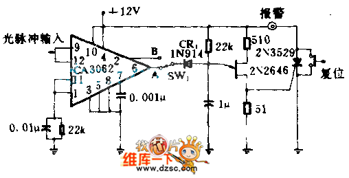 The circuit is used to detect the missing optical pulse or shortage of goods on the conveyor belt. CA3062 combination of detectors and amplifier can detect optical pulse which is synchronous with 60HZ power frequency . When switch SW1 is at A, every pulse has a interval of 16.7ms. It makes 2N2646 unijunction transistor reset at 20ms timing network. It avoids unijunction transistor triggering and triggers controlled rectifier. The alarm will be connected. When the SW1 at B, the circuit stops the detection of steady-state beam. It only alarmsat uninterrupted time.