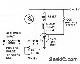 Silicon controlled switch is triggered when temperature-, light-, or radication-sensifive resistor Rs up to meter drops below vadue of preset potentiometer.Interchanging Rs and potentiometer will trigger alarm on increase in sensing resistor.- Transi stor Manual, Seventh Edition, General Electric Co., 1964, p 425.
