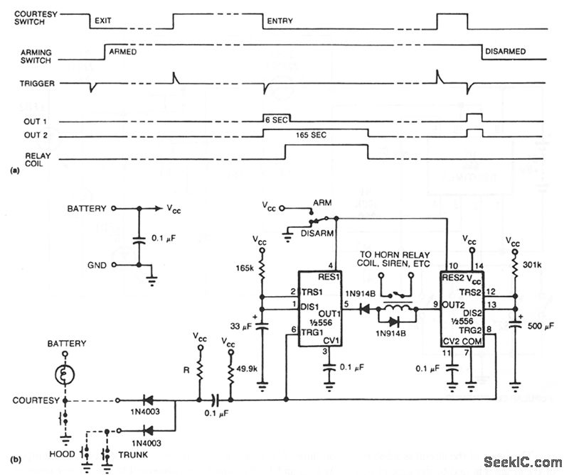 See (a) for the timing information for the alarm circuit in (b). When leaving your vehicle, flip the arming switch and close the door to arm the device. Subsequent opening of an entrance triggers both timers.After the expiration of the entry delay timer, the alarm sounds for a time determined by the second timer.The value of R should be less than 1 KΩ. If you use an incandescent lamp instead of a resistor, you get an extra function-an open-entrance indicator. By keeping the resistance low, you avoid false tripping should water collect under the hood. If your door switch connects the courtesy light to 12 V rather than ground, use a single transistor as an inverter at the input.