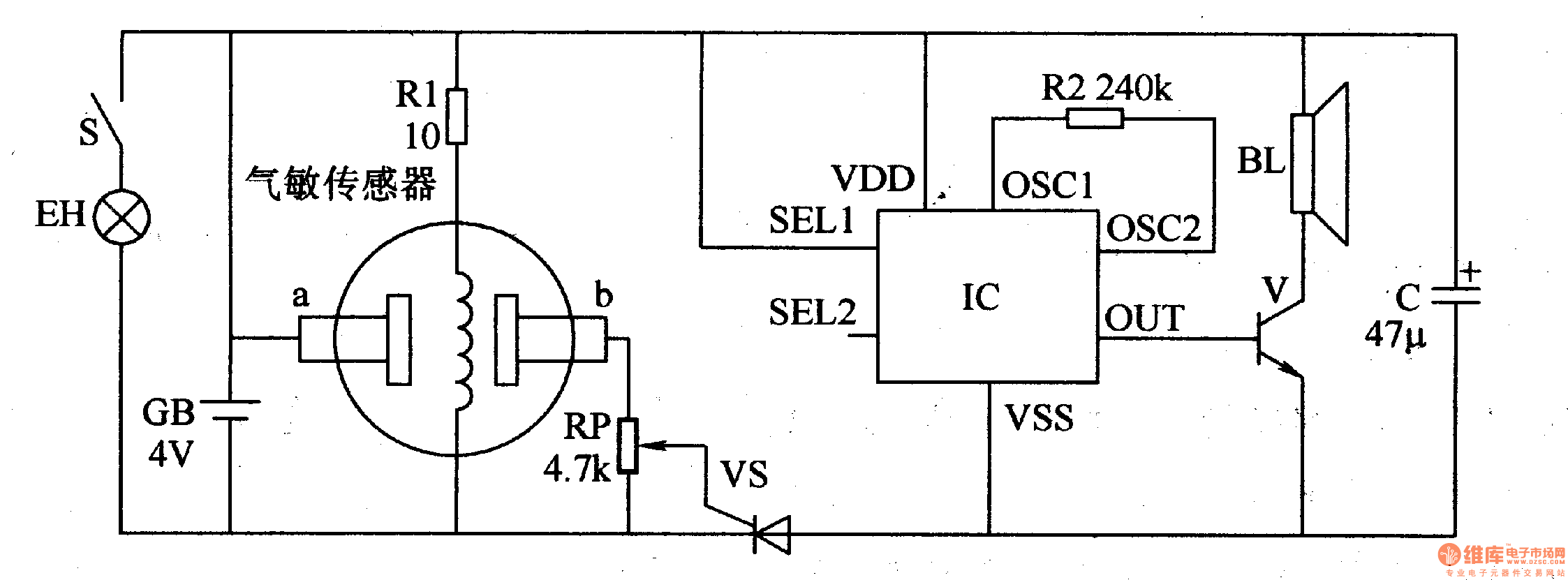 When the gas concentration is over the limit of safety standards, the conductivity between a and b of gas sensor will increase, the voltage of b point increases, VT turns on by trigger, and IC works, the audio output signal amplified by the V will drive the alarm BL.