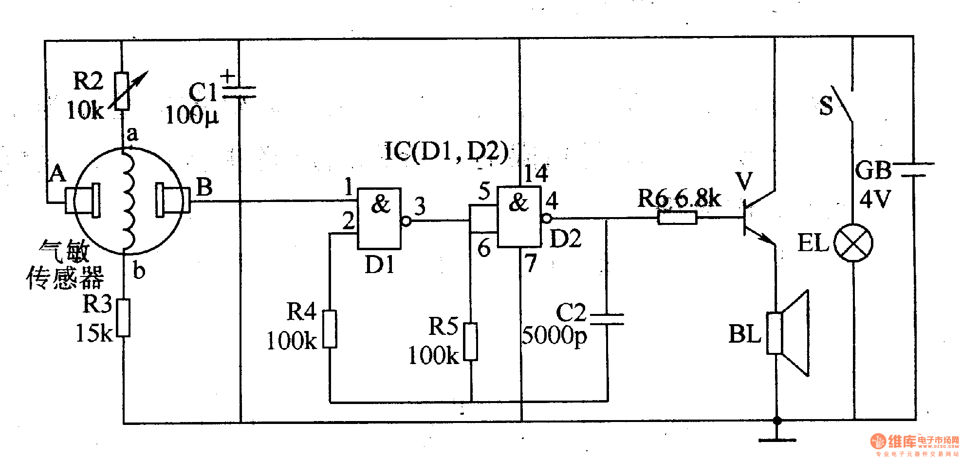 When the indoor concentration of combustible gasis inthe allowable range (less than limit value), the resistance between the gas sensors A, B is high,the foot voltage of Ic is low, multivibrator does not work, the speaker BL has no sound. When the indoor concentration of combustible gasis over the limit, the resistance between the gas sensors A, B declines,the foot voltage of Ic is higher than conversion voltage of D1, multivibrator works,the output oscillation signal frompin 4of IC. The signal amplified by the V will promote the speaker BL.