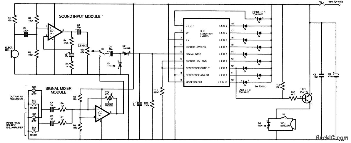 This circuit uses two audio amplifiers, one for a microphone and one for a stereo input, to drive an LED bar-graph display, rather than a meter. When the input exceeds a certain level, an LED (#8 in this circuit) will light and also cause an alarm buzzer or some other signal to actuate. A switch is provided for source selection.