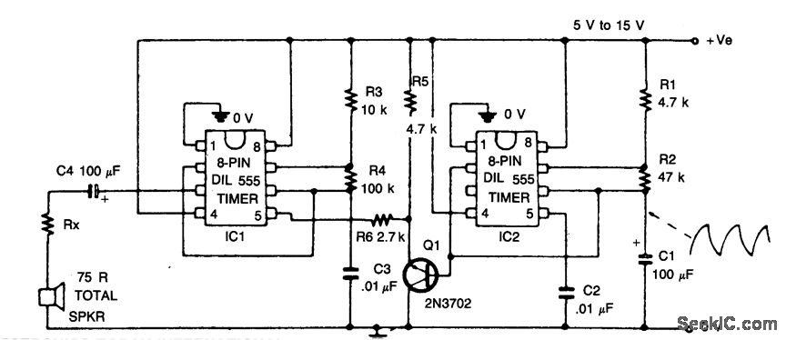 This circuit simulates the sound of an American police siren. IC2 is wired as a low frequency astable that has a cycling period of about 6 seconds. The slowly varying ramp waveform on C1 is fed to pnp emitter follower Q1, and is then used to frequency modulate alarm generator IC1 via R6. IC1 has a natural center frequency of about 800Hz. Circuit action is such that the alarm output signal starts at a low frequengy, rises for 3 seconds to a high frequency, then falls over 3 seconds to a low frequency again, and so on ad infinitum.