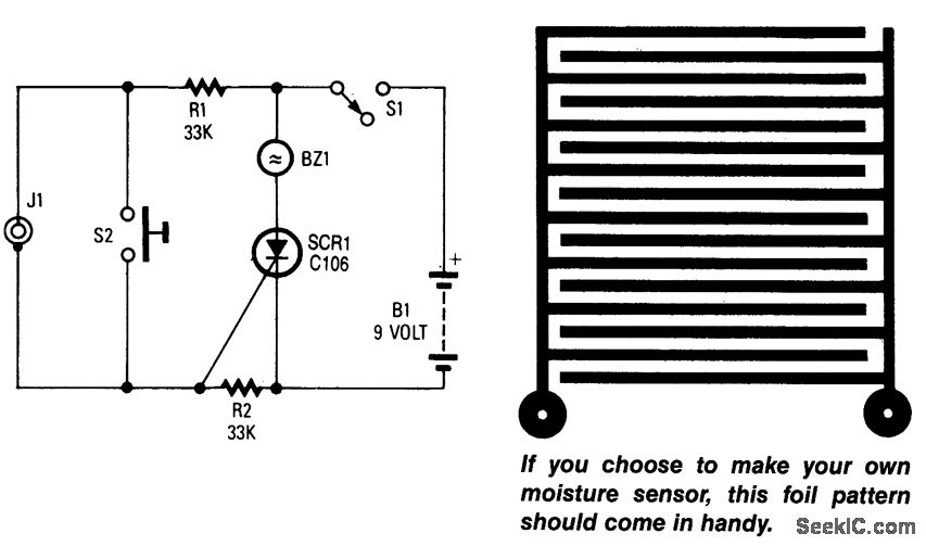 A sensor connected to J1 causes SCR1 to conduct, which sounds buzzer BZ1. The sensor is a PC-board foil pattern grid. Several sensors can be wired in parallel for increased coverage or to monitor sev-eral places simultaneously.