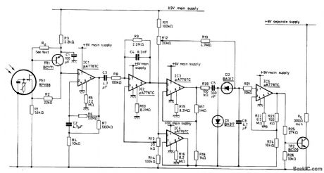 Use of programmable μA776 opamps reduces standby current of infrared alarm to 300 μA, permitting operation from small rechargeable cells. Detector is Mullard RPY86 that responds only to wavelengths above 6 μm, making it immune to sunlight and backgrounds intermittently illuminated by sun. Low-cost mirror is used instead of lens to concentrate infrared radiation on detector. Rd is chosen to make input to first opamp between 2 and 6 V. Circuit energizes alarm relay RL only when incident radiation is changed by movement of intruder in monhored space.- Ceramic Pyroelectric Infrared Detectors, Mullard, London, 1978, Technical Note 79, TP1664, p 8. (View)