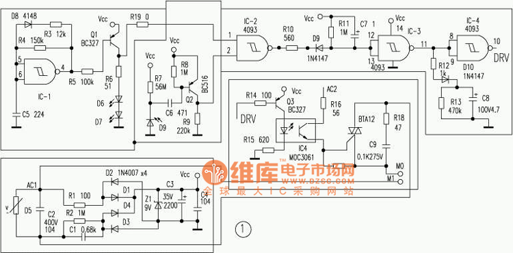 The analysis of hand drier circuit's woking principle.The PCB is the main component of the Kewei hand drier. The author has drew this hand drier's full circuit according to the physical PCB, which is shown in picture 1. And the author has also drew this hand drier's working principle diagram by analysing the circuit in picture 1, which is shown in picture 2.1.The power supply circuit.The Kewei hand drier's power supply uses the commercial power 220V as its power supply. The voltage, which the circuit needs, is the DC low voltage (9V). It firstly uses the capacitor C1 to current limiting and voltage step-down. And then it is rectified by diodes D1~D4 and filtered by the electrolytic capacitor C3. At last it would be regulated by the voltage regulator tube Z1. Then it would output the Vcc (9V) DC voltage to supply the hand drier's each part's power. It is added a capacitor C2, C4 for high-frequency pulses filter and a voltage varistor D5 for peak pulse spike limiting in the power loop circuit.
