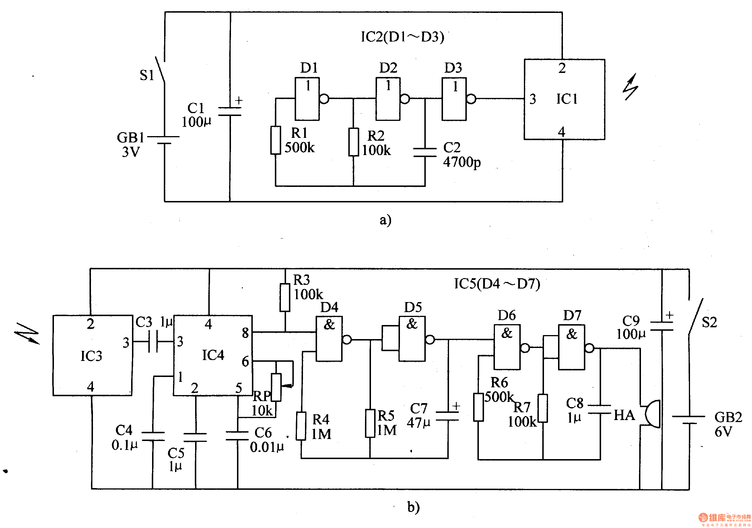 When the distance is beyond 5m, IC3 will receive no wave and IC4's pin 8 will output high level. The oscillator will begin to work. HA will make an alarm sound.