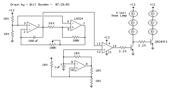 This circuit is similar to the Fading Red Eyes circuit (in the LED section) used to fade a pair of red LEDs. In this version, the lamps are faded by varying the duty cycle so that higher power incandescent lamps can be used without much power loss. The switching waveform is generated by comparing two linear ramps of different frequencies. The higher frequency ramp waveform (about 75 Hz.) is produced from one section of the LM324 quad op-amp wired as a Schmitt trigger oscillator. The lower frequency ramp controls the fading rate and is generated from the upper two op-amps similar to the fading eyes circuit. The two ramp waveforms at pins 9 and 1 are compared by the 4th op-amp which generates a varying duty cycle rectangular waveform to drive the output transistor. A second transistor is used to invert the waveform so that one group of lamps will fade as the other group brightens. The 2N3053 will handle up to 500 milliamps so you could connect 12 strings of 4 LEDs each (48 LEDs) with a 220 ohm resistor in series with each group of 4 LEDs. This would total about 250 milliamps. Or you can use three 4 volt, 200 mA Xmas tree bulbs in series. For higher power 12 volt automobile lamps, the transistor will need to be replaced with a MOSFET that can handle several amps of current. See the drawing below the schematic for possible hookups.