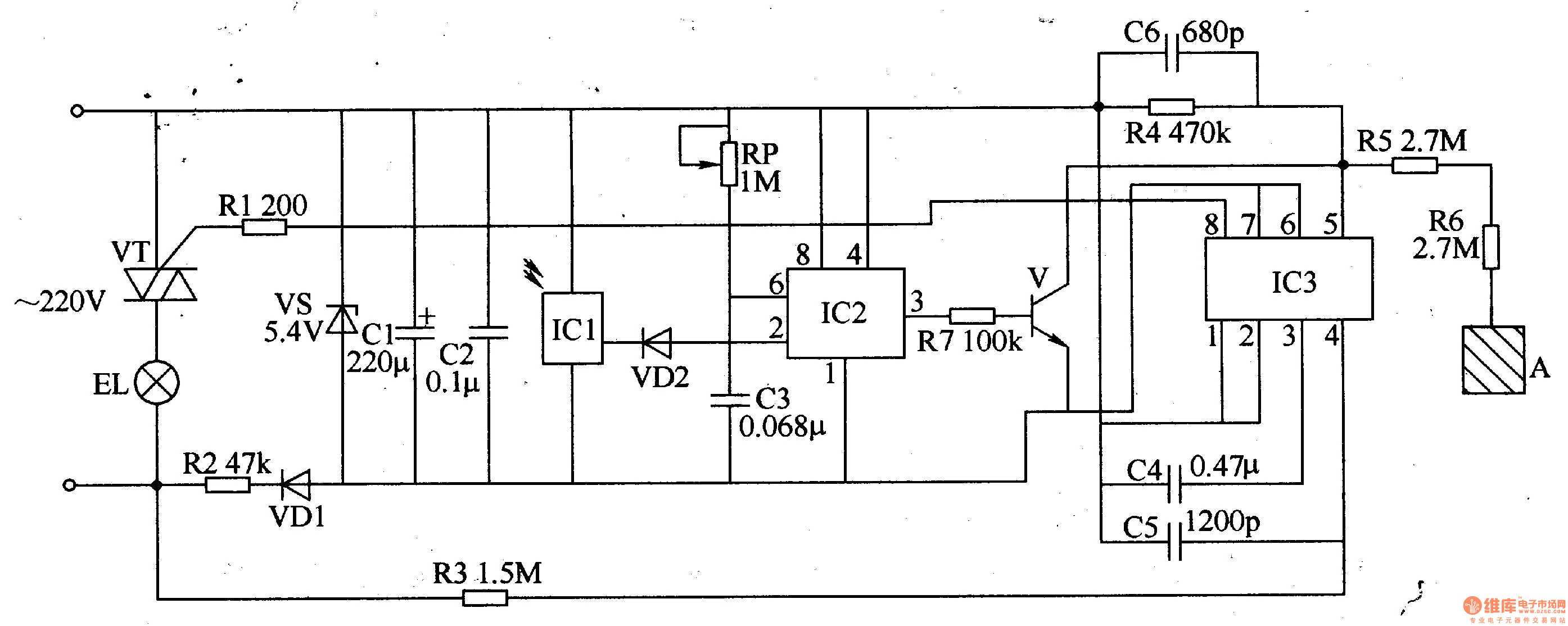AC 220V voltage filtered by R2-limiting step, VDl rectifier, VS regulator and Cl, C2. It provide DC voltage about 5V for ICl-IC3 (Vcc).In pressing the remote control button, the remote control infrared remote control pulse(the time is less than 0.45 when press the remote control button , the remote control application output pulses 1-3; if the remote control button press time over .45 , the output of the remote control more than 3 Burst). 1C1 will receive the infrared pulse train amplification, demodulation, and plastic surgery and other treatment, output a low pulse, the VD2 turn, C3 quickly discharges. When the voltage across C3 is lower than Vcc / 3 时, IC2's output of 3 feet high, so that V conduction. When through a pulse train, VD2 end, +5 V voltage charging of C3 by the RP, the IC2 pin 2, 6-pin voltage rise, when the voltage is increased to 2Vcc / 3 时, lC2 flip-circuit, 3-pin change low, V cut-off. If the new moon in the C3 charge between ICl and output a low pulse, C3 will discharge again, then keep the output of IC2 3 feet high.