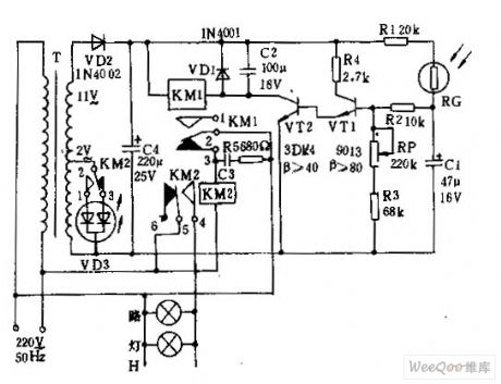 Connected to 220v AC power,the both ends of capacitor C4 will obtain ten 12v DC.At night,photoresistance RG is a high resistance,transistor VTl, v1,v2 are closed.The relay KMl has no power,the contacts 2-3 of KMl are closed.AC relay KM2 works with power.The contacts l-2 ,4-5 of KM2 are closed, light-emitting diode vD3 displays $signal instructions,floodlight H automatically kindle.At dawn,RG is a low resistance,VT1 conducts when it obtains base current,the radiation high potential output makes vT2 saturated conductivity.