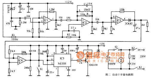 This circuit is consists of transimitting and infrared receiving control parts. Infrared transmit partproduces 5kHzfrequency by using 555 time-based circuit, drive infrared tubestransmit infrared light.When hand is under the dryer, because of infrared reflection action, PH302 will receive infrared and change it into electrical signals, by frequency selective amplifier which composed by IC1, IC2,IC3, it's output signal becomes DC signal into IC4 comparator after enlargement, plastic andfiltering. When the input level of IC4 isover 7V, its output changes into low level, trigger IC5 timer starts timing, pin 3 becomes high-level, 3DG130 connected, relay contacts suck close, connect resistance wire and fan.