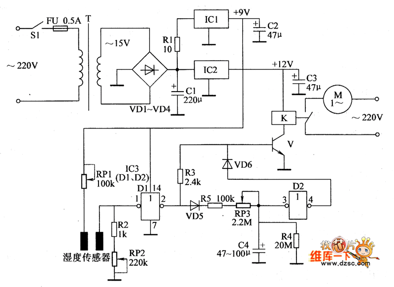 The automatic sprinkler controller circuit is composed of the power supply circuit and humidity measurement and control circuit, and the circuit is shown as the Figure. Power supply circuit is composed of the power transformer T, rectifier diodes VD1 ~ VD4, filter capacitors C1 ~ C3 and three-terminal integrated regulators ICl, IC2 and so on. Humidity measurement and control circuits is composed of the humidity detector, NOT gate integrated circuit IC3 (Dl, D2), transistor V, Relay K and the external components. R1 uses l/2W carbon film resistor: R2 ~ R5 select l/4W carbon film resistors. RP1 ~ RP3 use small synthetic carbon film potentiator.