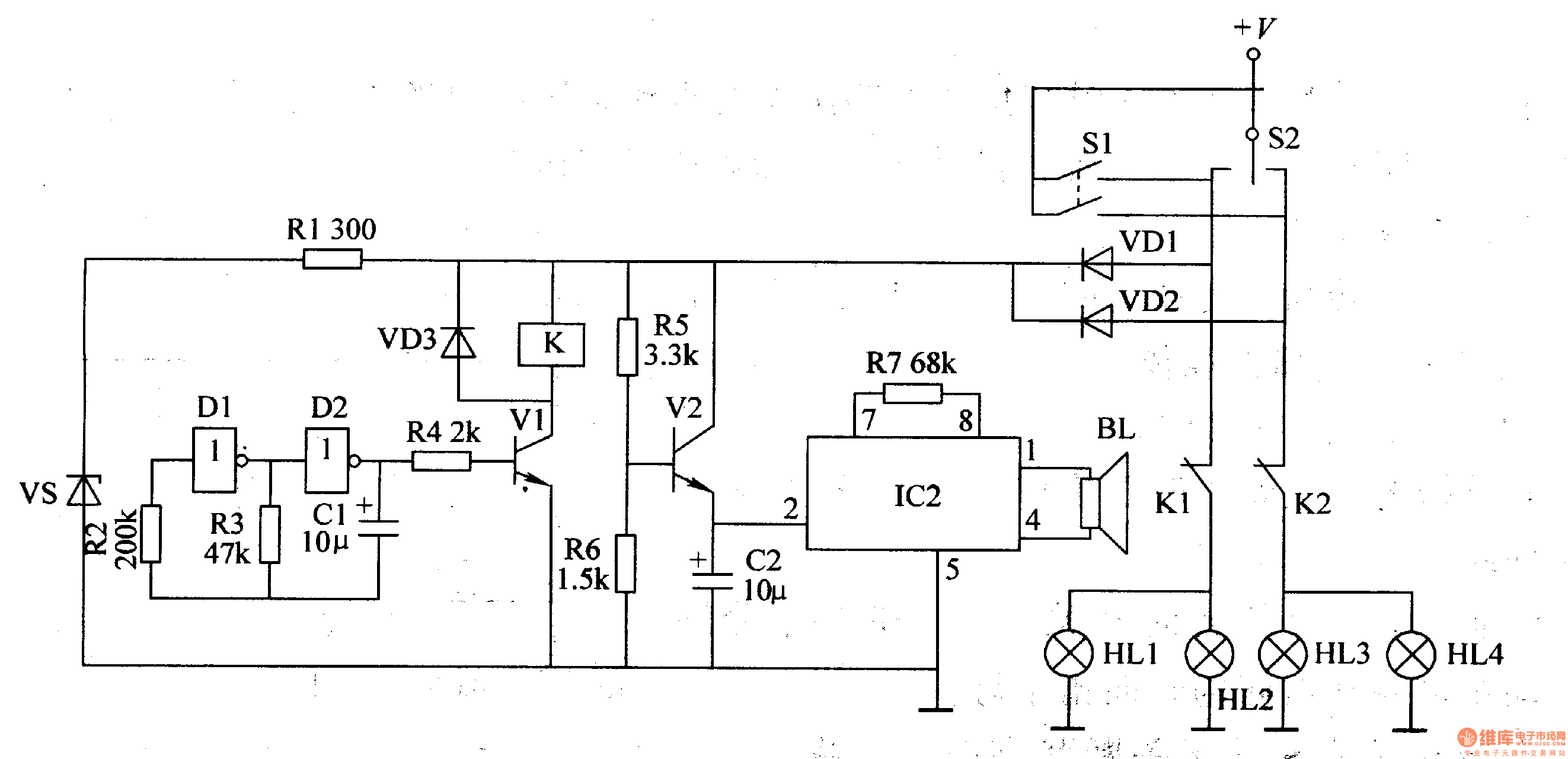 When S2 is connected, +V will provide the square wave oscillator with working power after limitation and stablization. When the oscillator begins to work, it will generate 1Hz square wave oscillate signals which will make V1 connected intermittently and the turn lamp will begin to twinkle. When the square wave signals are positive, V1 is connected and K is connected. HL1, HL2 or HL3, HL4 will be illuminated. When the square wave signals are negative, V1 is disconnected and K is released. The turn lamps will be off.