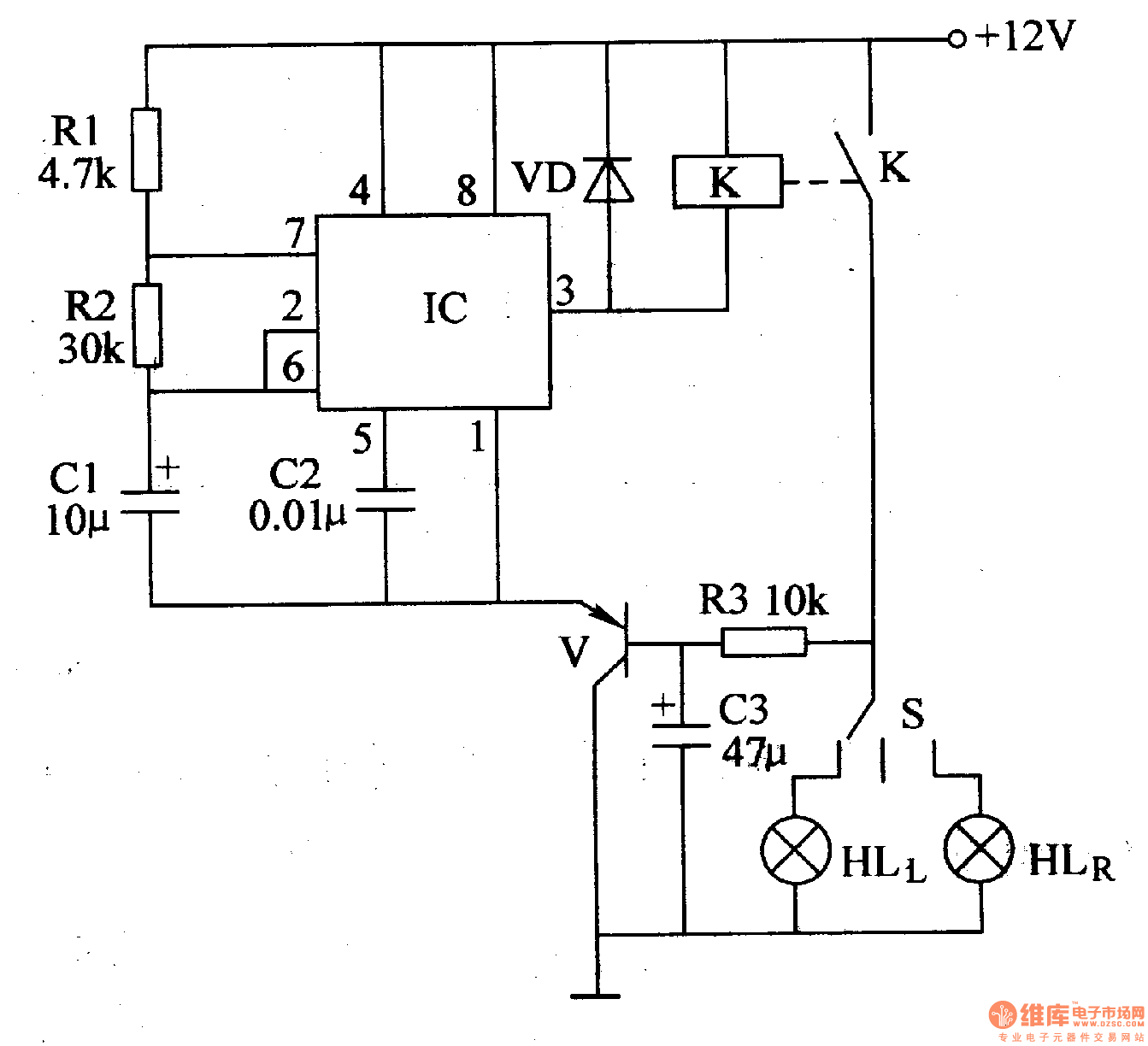 When S is disconnected, V is disconnected. IC's pin 1 and pin 3 will output high level while the oscillator doesn't work. When S is connected, V is connected. IC's pin 1 will output low level. The oscillator begins to work. IC's pin 3 will output oscillate signals which will make K connected and disconnected intermittently. HLL or HLR will be illuminated simultaneously. When S is put in the middle, V is disconnected. The oscillator will stop working. The turn lamps will be off.