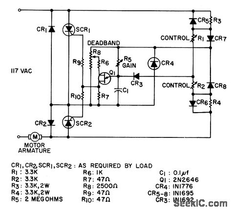 Phase-sensitive servo drive supplies reversible half-wave power to armature of small permanent magnet or to shunt motor. Power circuit consists of two half-wave circuits back-to-back (SCR1-CR1 and SCR2-CR2) fired by ujt Q1 on either positive or negative line half-cycle depending on direction of unbalance of reference bridge containing sensing element R1, which can be photoresistor, thermistor, potentiometer, or output from control amplifier.- Silicon Controlled Rectifier Manual, Third Edition, General Electric Co., 1964, p 142.