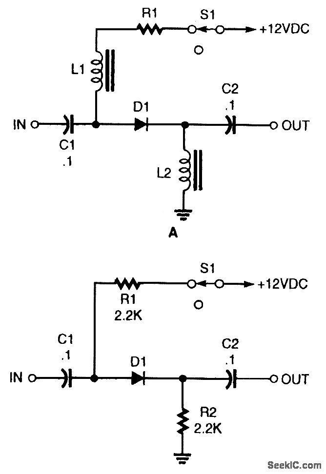 D1 is a pin diode (MV3404) used as a SWitch,with dc bias supplied via R1. L1 and L2 are RF chokes An alternative approach eliminating the RF chokes is also shown