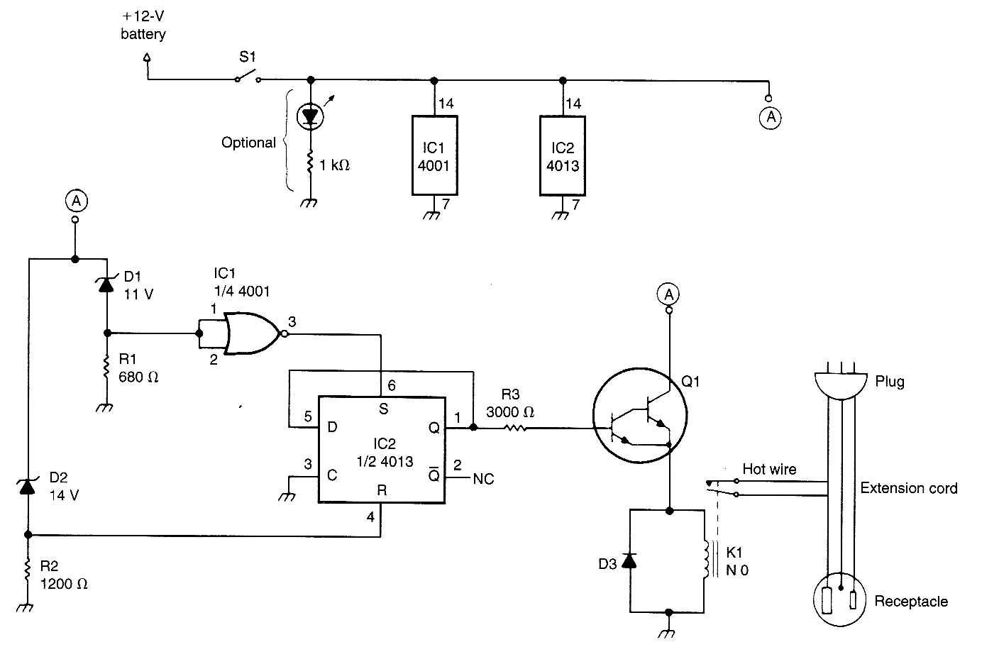 This circuit uses a pair of Zener diodes to monitor battery voltage of a 12-V battery. If below 11 V, D1 ceases to conduct, pin 3 of IC2 goes high, setting FF IC2 turning on Q1, K1, and the battery charger. At excess of 14-V battery voltage (full charge), D2 conducts, resetting FF IC2, and cutting off the battery charger.