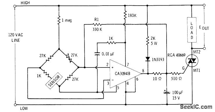 Developed for use with AC sensor in one leg of bridge. CA3094 is shut down on negative half-cycles of line. When bridge is unbalanced so as to make pin 2 more positive than pin 3, IC is off at instant that AC line swings positive; pin 8 then goes high and drives triac into conduction. Triac conduction is maintained on next negative half-cycle by energy stored in 100-μF capacitor. Bridge unbalance in opposite direction does not trigger triac.-E. M. Noll, Linear IC Principles, Experiments, and Projects, Howard W, Sams, Indianapolis, IN, 1974, p 313-314.