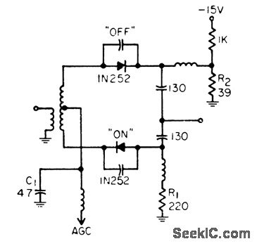 Agc is applied to center tap of transformer, to turn one diode off while other is being turned on. Attenuation can be 40 db over bandwidth up to 250 Mc with agc bias of 0.5 to 3 v. Insertion loss is only a few db.-W.A. Rheinfelder, Designing Automatic Gain Control Systems, EEE, 13:1, p 53-57.