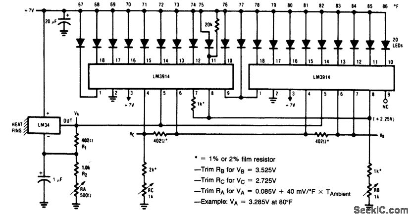 Fig. 13-9 This circuit combines an LM34 temperature sensor, two LM3914 display drivers, and 20 LEDs to form a temperature display where the temperature is indicated by turn-on of the corresponding LED (from 67 to 86°F). The temperature range can be increased by cascading several LM3419s. The display can be converted from the dot mode to the bar mode, or to flash a bar of LEDs when the temperature sensed reaches a selected limit. This requires a few extra components, as shown on the LM3419 datasheet. Note that the trim values for VA, VB and 1/C are for the temperature range show. UB and VC represent the highest and lowest temperatures, respectively. VA is set for gain of 4 (40 mV/°F instead of the nominal 10 mV/'F provided by the LM34). National Semiconductor Linear Applications Handbook 1991 p 1077.