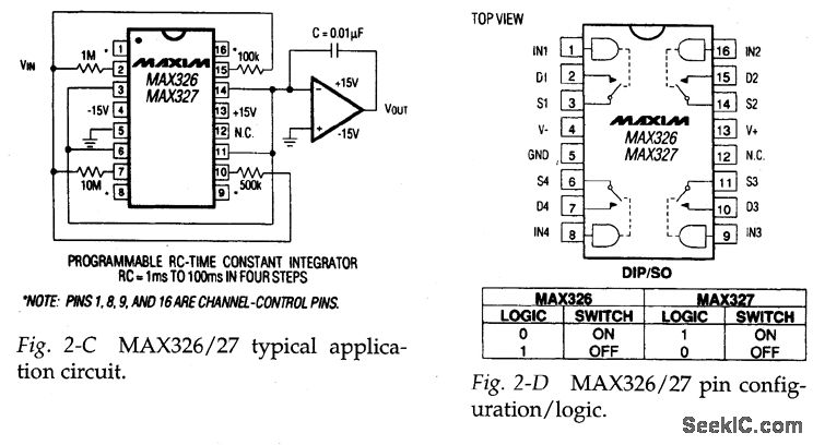 Figures 2-C and 2-D show the typical application circuit and pin configuration/ logic, respectively, for the MAX326/27. Test this ultra-low-leakage CMOS analog switch by applying and removing +5 V to the channel-control pins, and checking that the corresponding switches open and close. Use an ohmmeter connected across the switch pins.