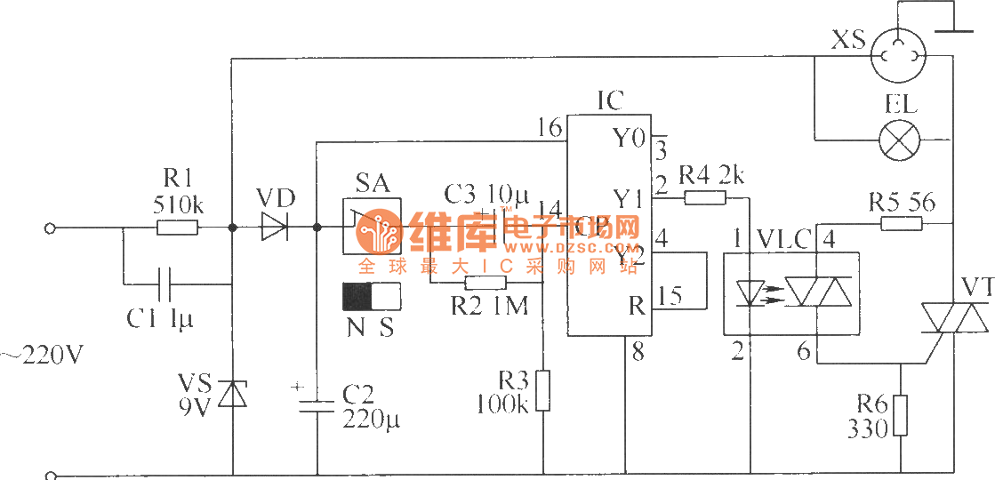 R1, R5 and R6 select 1/2W metal film resistors; R2~ R4 select 1/4W or 1/8W metal film resistors.C1 selects the polyester capacitor or CBB capacitor with pressure valuebeing more than 400V; C2 and C3 select 16 V aluminum electrolytic capacitors.VD uses 1N4007 type silicon rectifier diode.VS selects 1W, 9.1V silicon voltage diode .VT uses 2A, 400V TRIAC .VLC selects NOC 3020 optocoupler.IC uses CD4017 decimal counting / divider integrated circuit.SA uses the normally closed reed switch.